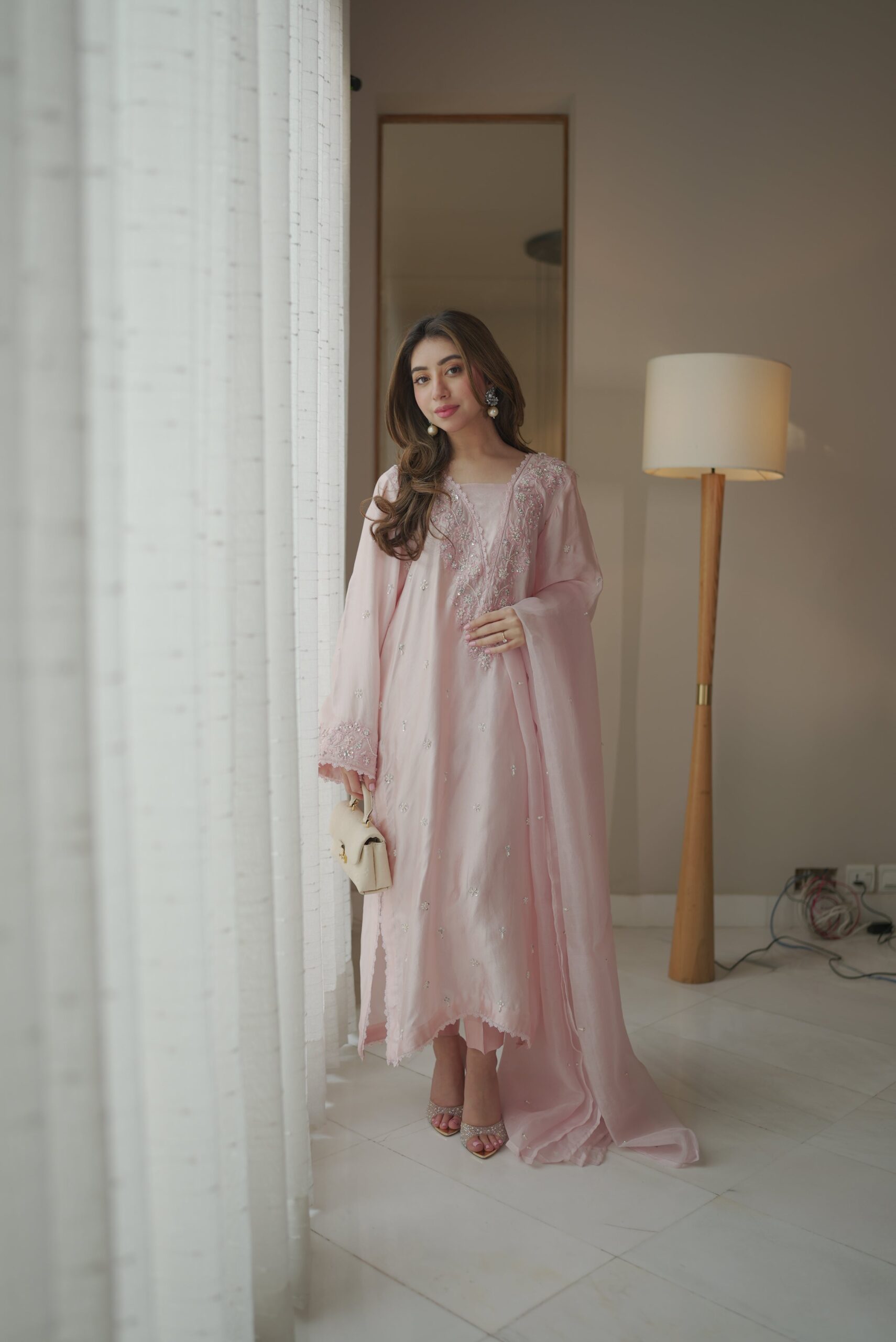 Pale Pink Color Thread embroidered Cotton Kurta With Pant Set