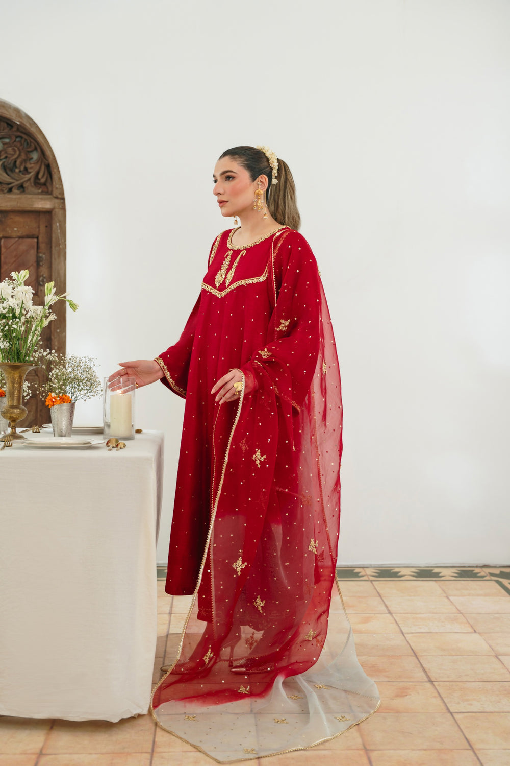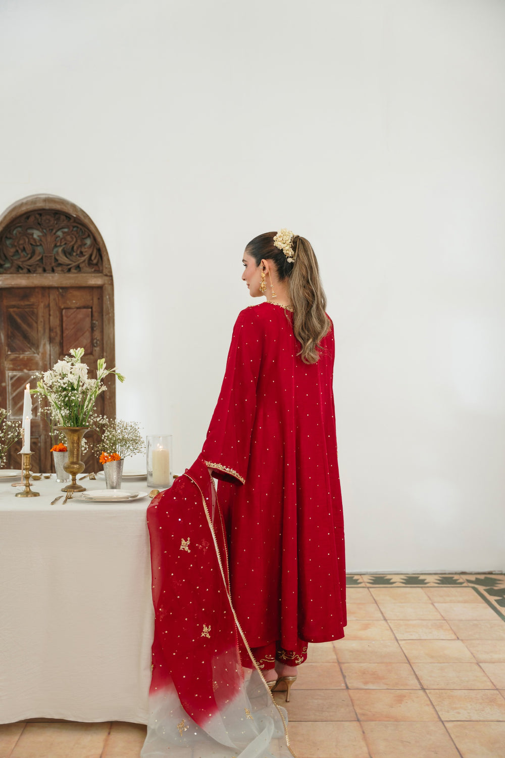 A vision of timeless poise and femininity, the deep crimson maroon pishwas captures the essence of refined wedding wear, intricately embellished with exquisite zardozi handwork in naqshi, dabka, sequins, and crystals. Paired with a regal embellished korean raw silk Izaar that adds timeless grandeur to the silhouette. The look is completed with a matching soft tye dye tissue organza dupatta, beautifully adorned with coordinating embellishments, creating a romantic and elegant ensemble. The length of the long kalidaar is 48 inches.