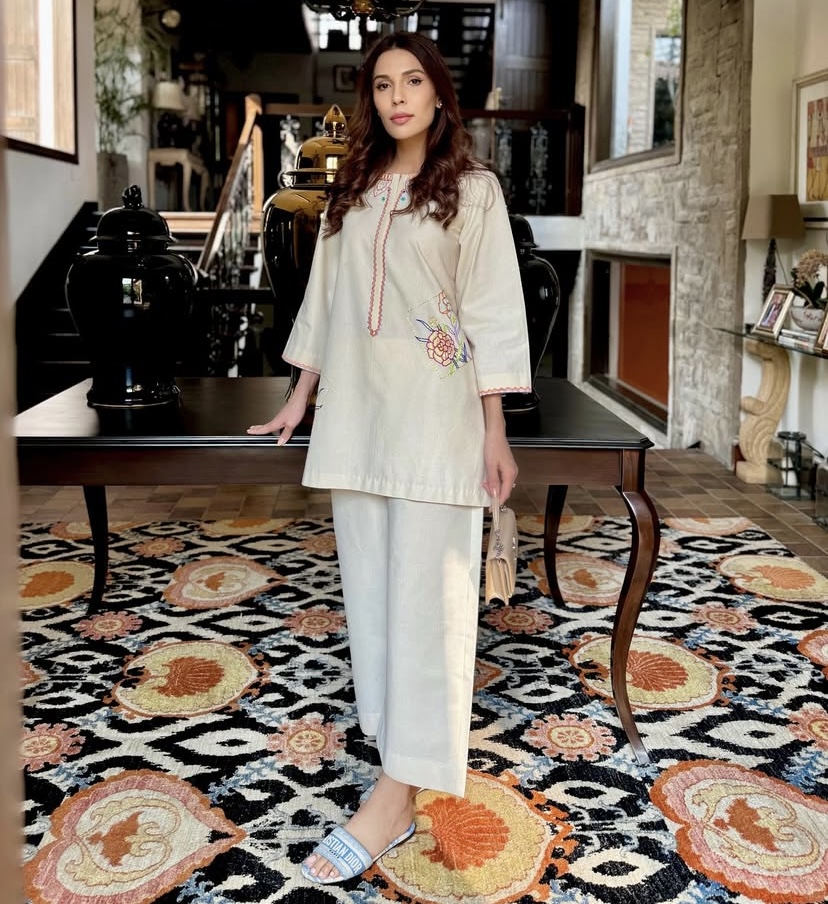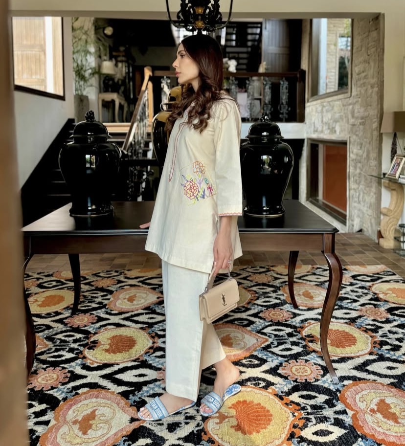 Elegant and modern, this beige co ord set features intricate floral embroidery and Paired with trouser, it’s perfect for semi-formal occasions.
