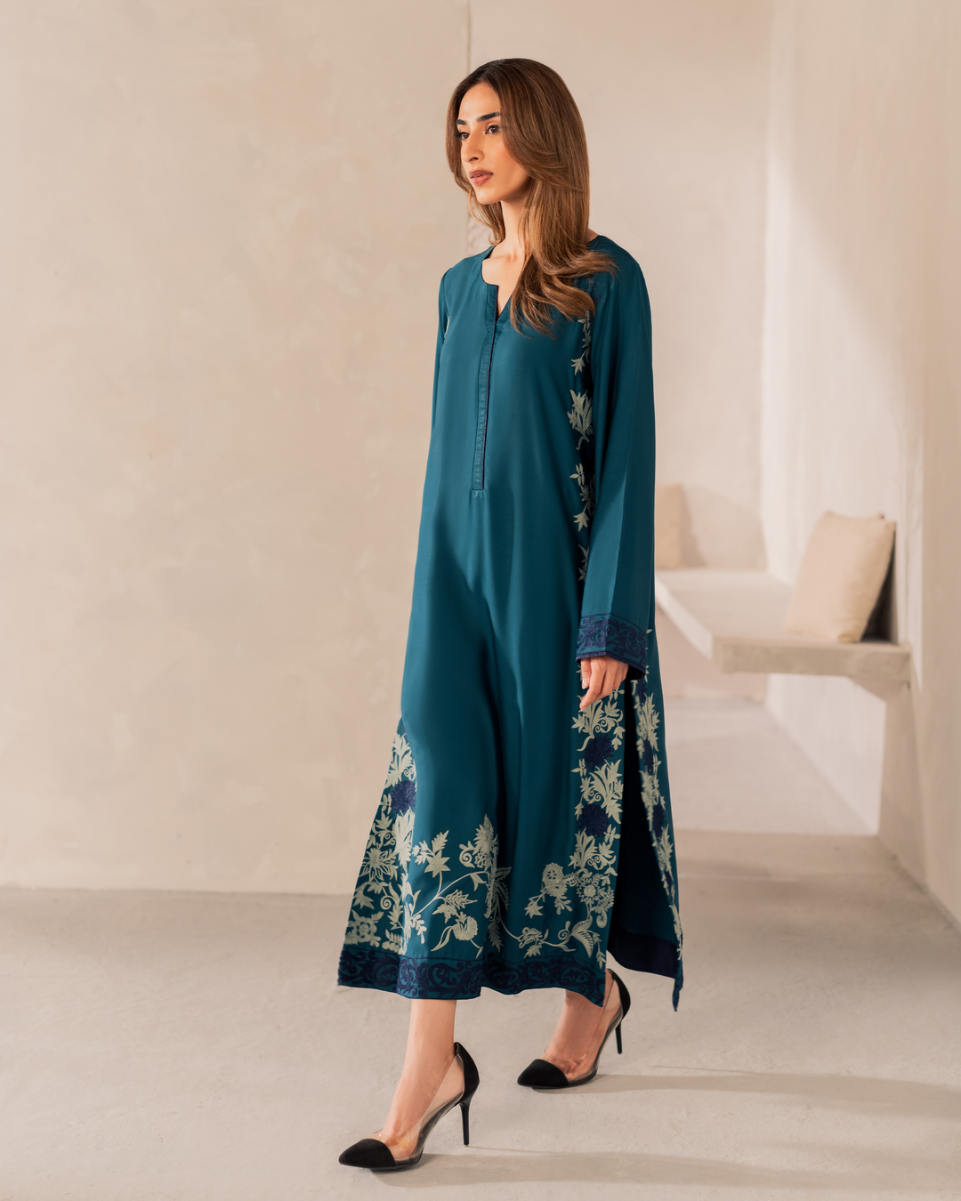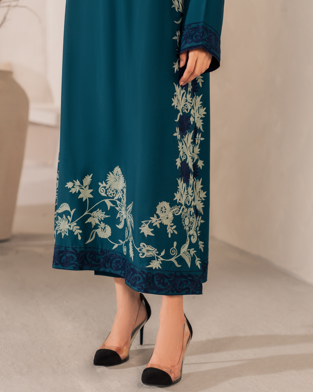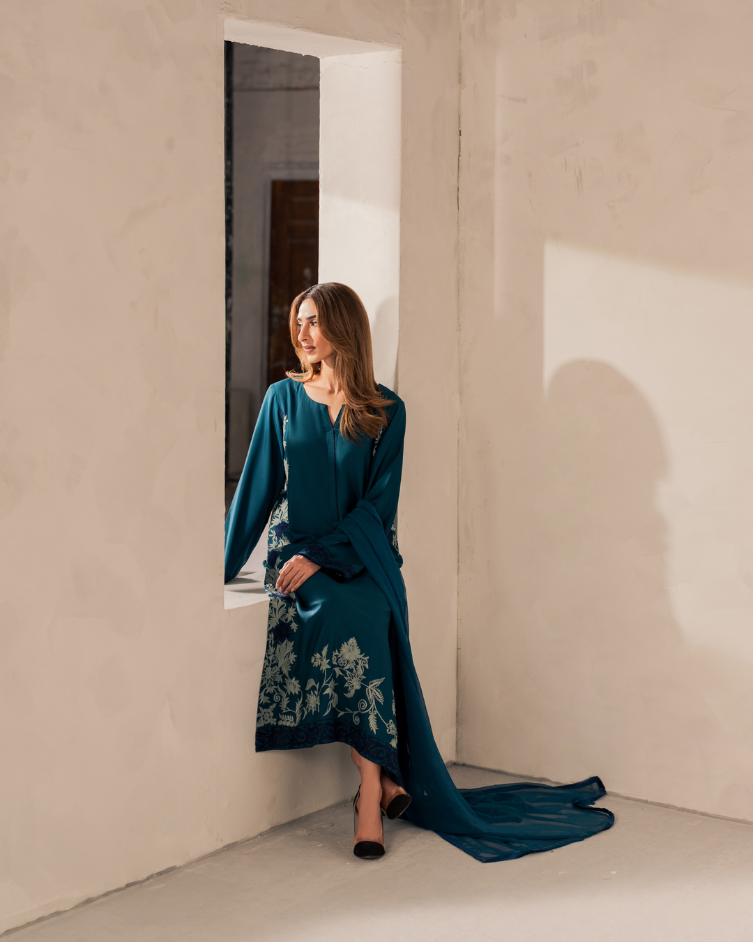 Your pick of the season – Elen embodies all the elements of grace and style. Adorned with intricate embroidery on Teal shirt with Blue panels.