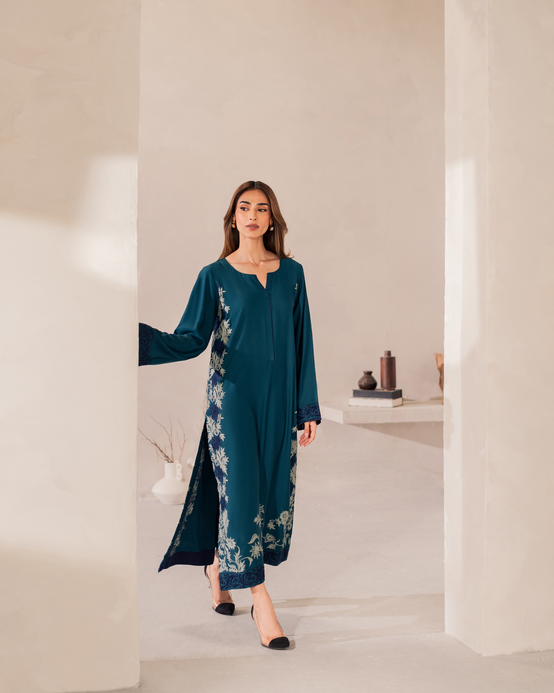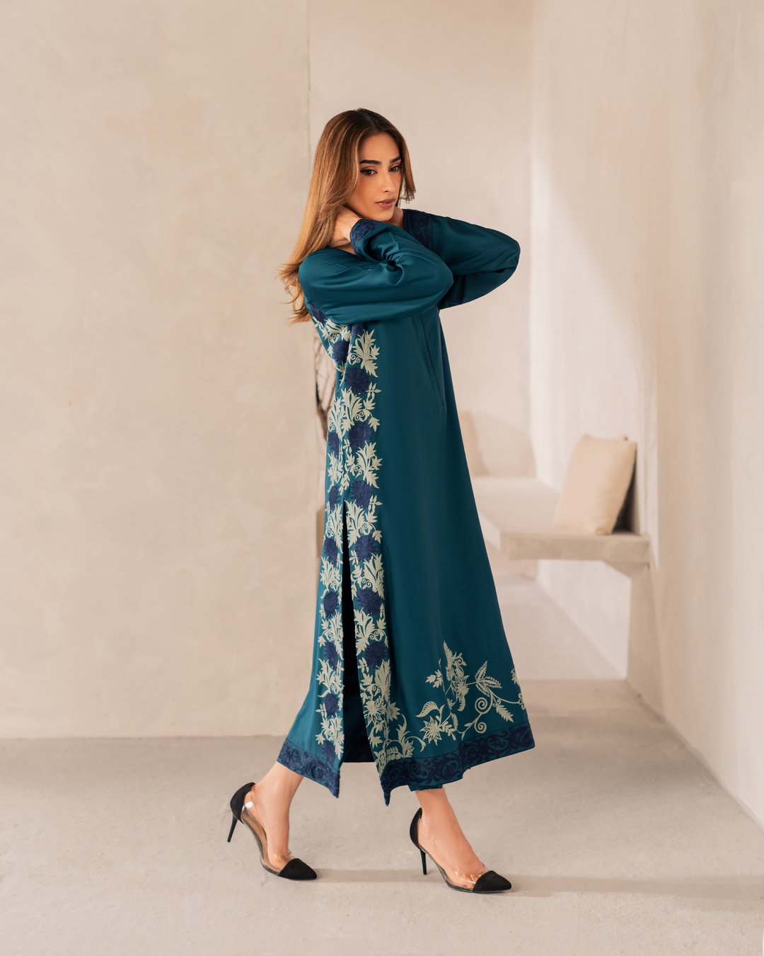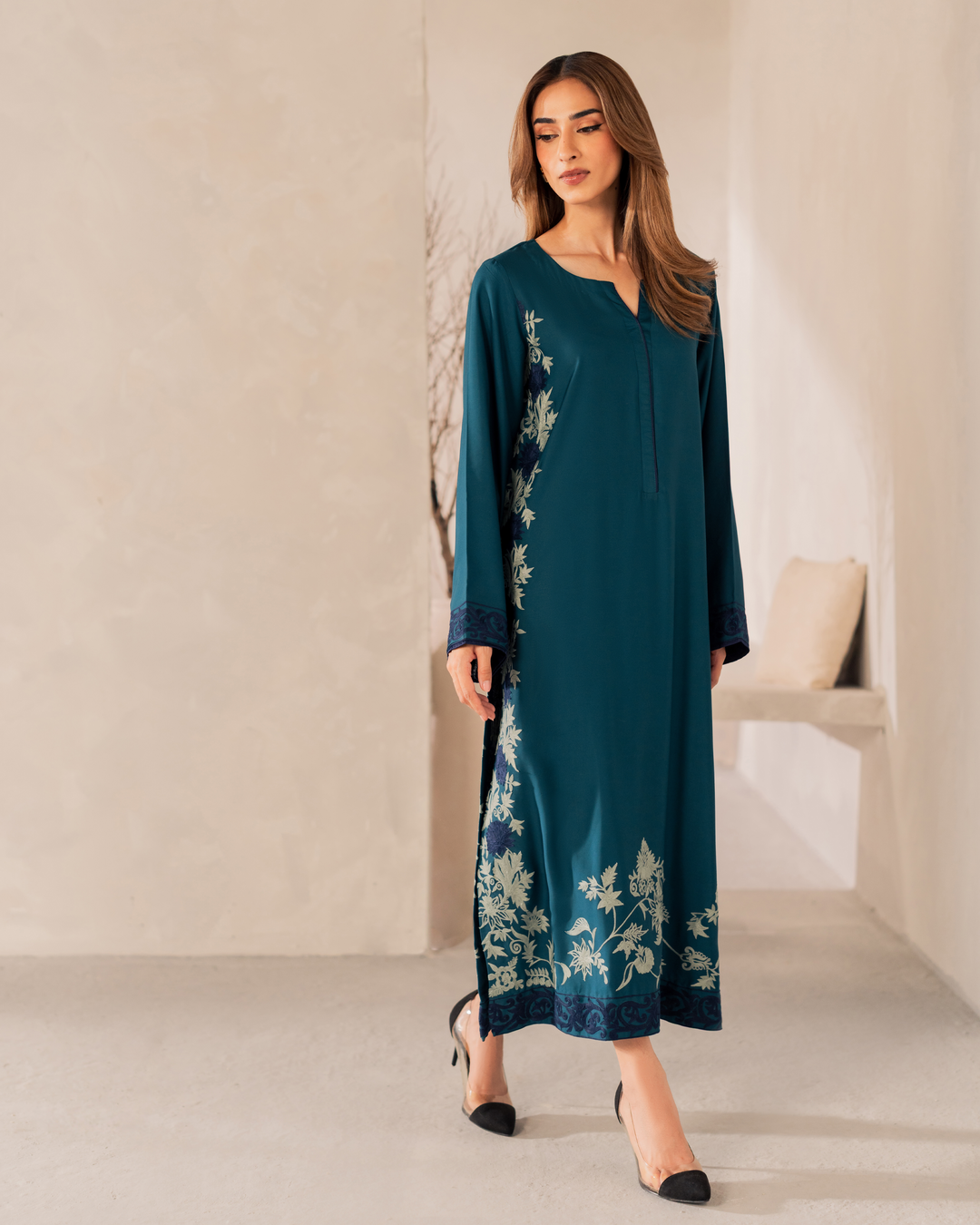 Your pick of the season – Elen embodies all the elements of grace and style. Adorned with intricate embroidery on Teal shirt with Blue panels.