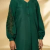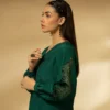 Crafted from luxurious Cotton, the shirt boasts a front cutline and is adorned with meticulously handcrafted buttons on the front, adding a touch of elegance and uniqueness. The sleeves are a work of art with bold embroidery and cut work details, featuring gathers and cuff sleeves that create an aura of sophistication. The outfit is paired with a cotton trouser featuring embroidered border, ensuring both comfort and contemporary style.