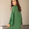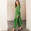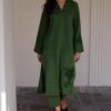 A stunning two piece emerald green outfit with appliqué on border and sleeves.
