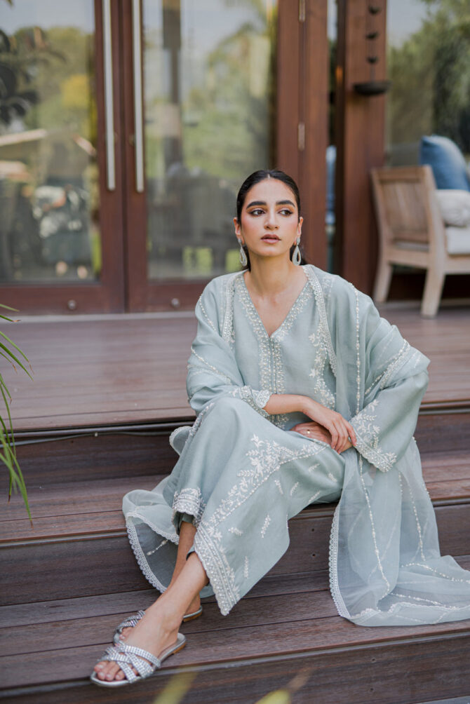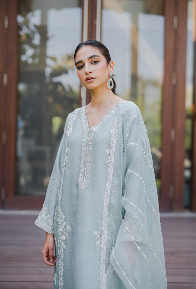 An understated pale-hued formal that features embroidered vines in shades of pearl across the front and the dupatta. Paired here with pant