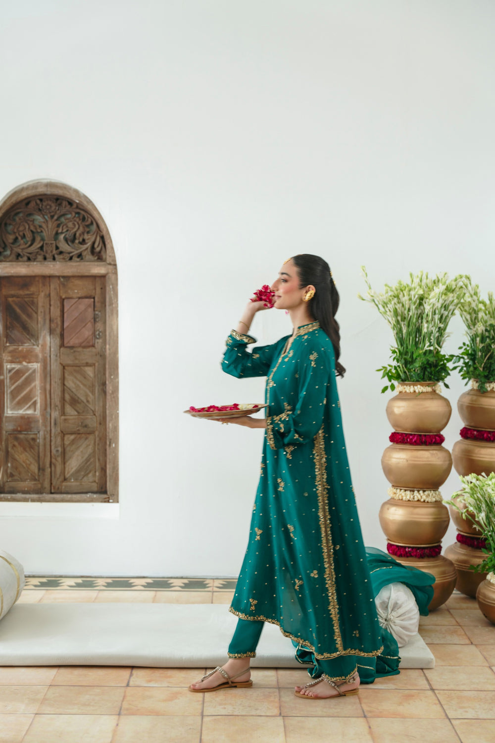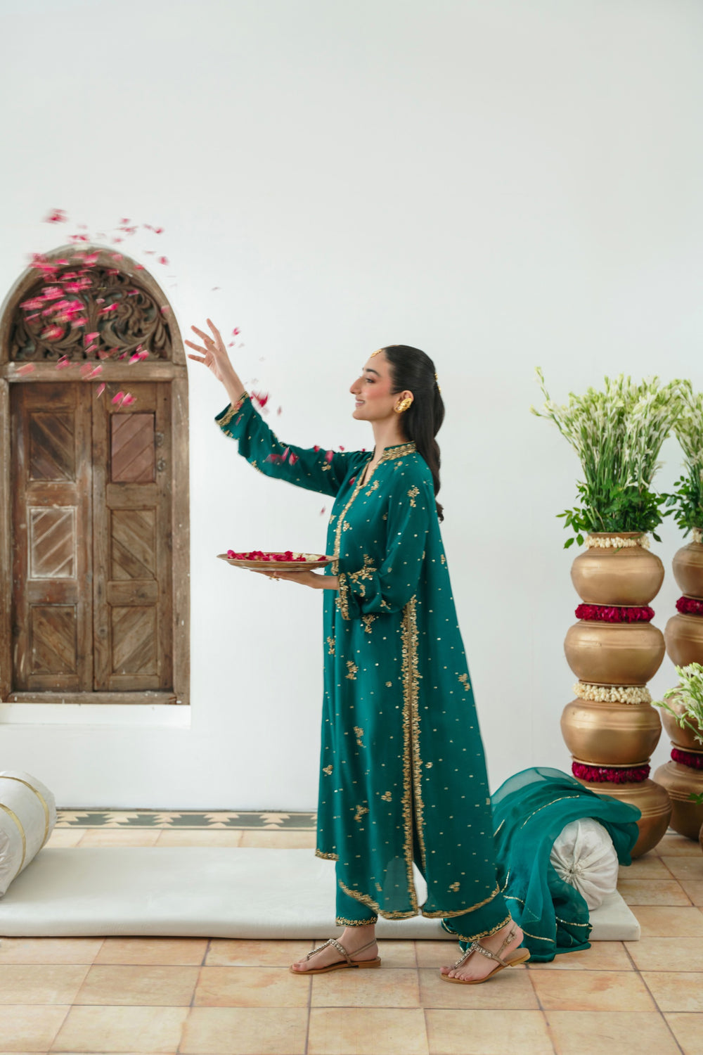 Crafted from luscious pure poison green raw silk, ” Ivan ” is heavily embellished with intricate detailed hand/ada work in gold dabka, naqshi, sequins and long panelled silhouette, perfect for subtle twirling. This look is completed with a dreamy soft tissue borders with silk&sequins border, the shalwar is adorned with a matching border as seen. A romantic, elegant three piece thats is sure to turn heads. The length of the long panelled kurta is 48 inches.