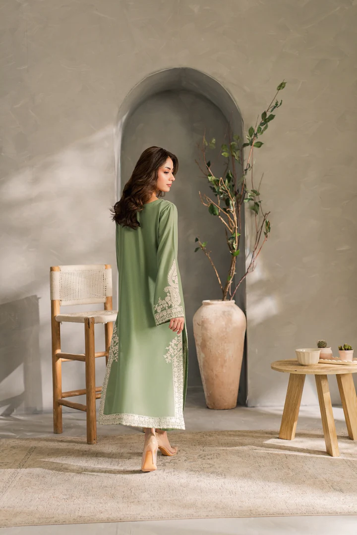 The Jane set is a graceful 3-piece ensemble in soothing sage green, delicately adorned with intricate hand-aari embroidery for a timeless Eastern charm. The Jane set includes a straight-cut kurta and matching trousers, both crafted in soft karandi fabric for all-day comfort. Pair it with the separately available laced dupatta to elevate the look with a refined, feminine touch.