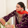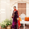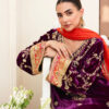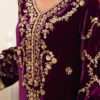 A heavily embellished beautiful three piece on Pure velvet, adorned with the most stunning hand work of dabka, naqshi, sequins and crystals done. Paired with a pure crushed burnt orange silk dupatta and matching pure raw silk straight trousers.