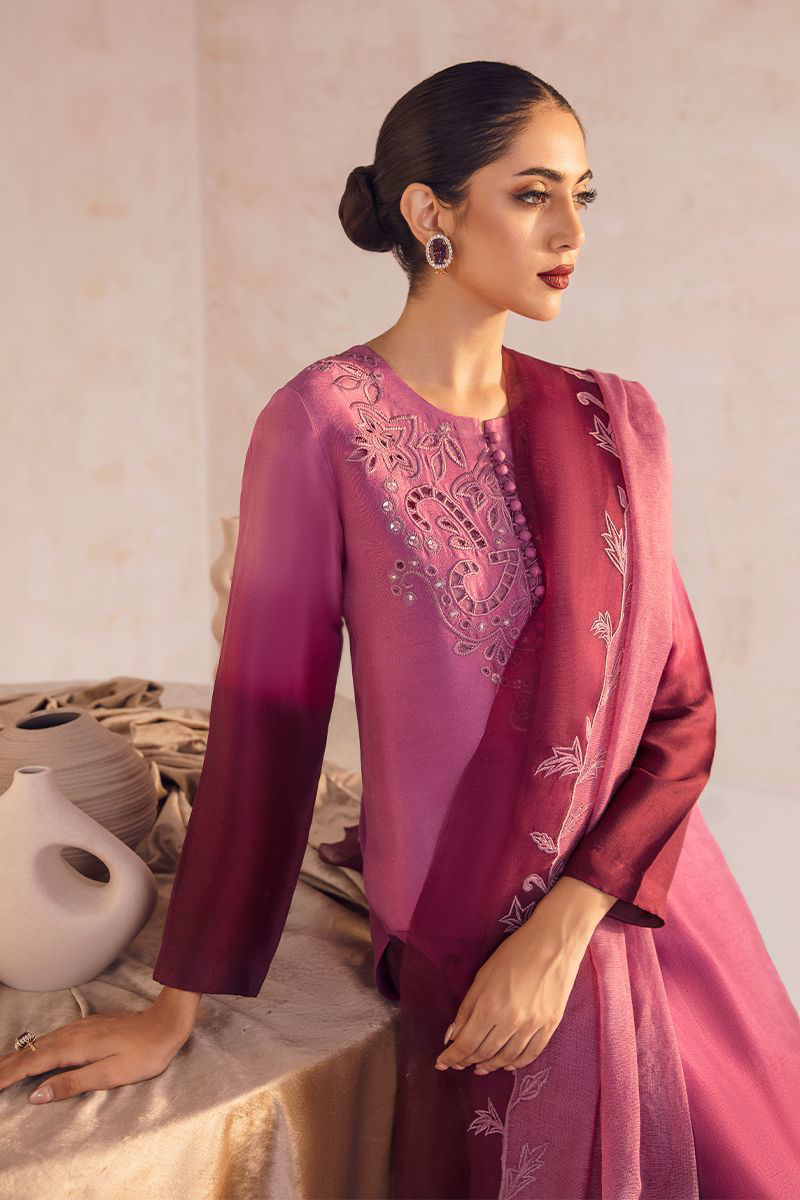 Ombre purple straight cutwork embroidered silk shirt with gorgeous buttons detailing on neck and it is paired with cotton net dupatta with organza and embroidery details and pants and dupatta.