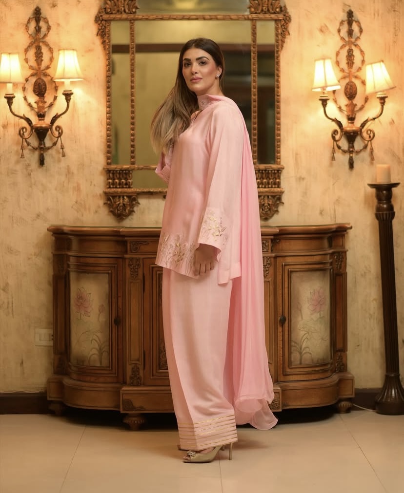 Elegant and modern, this powder peach ensemble features intricate embroidery and Paired with farshi salwar, it’s perfect for semi-formal occasions.