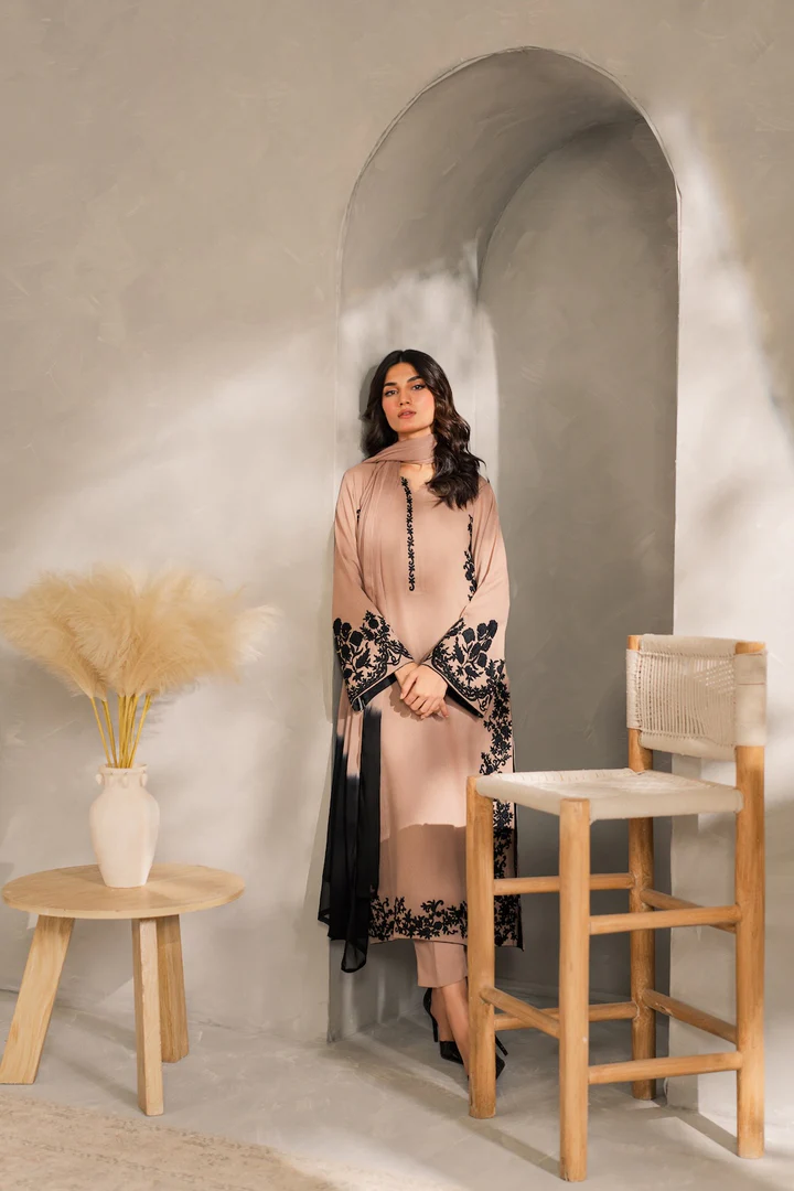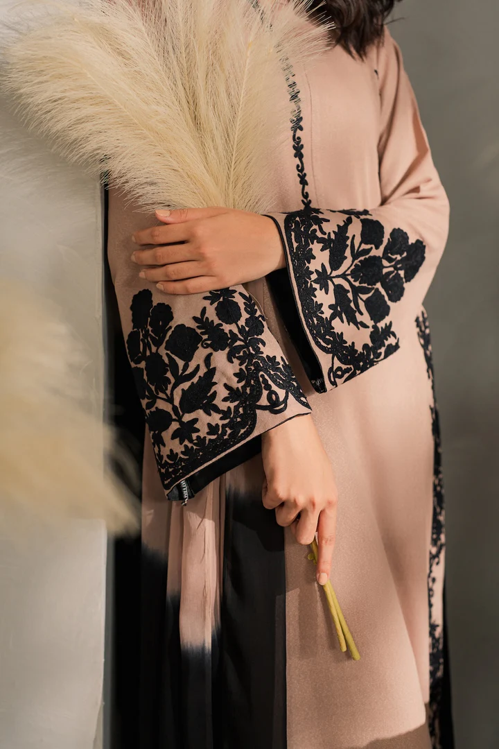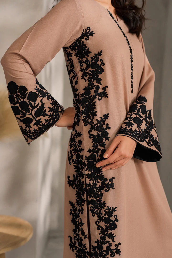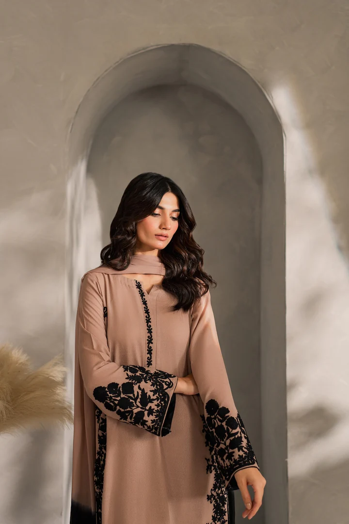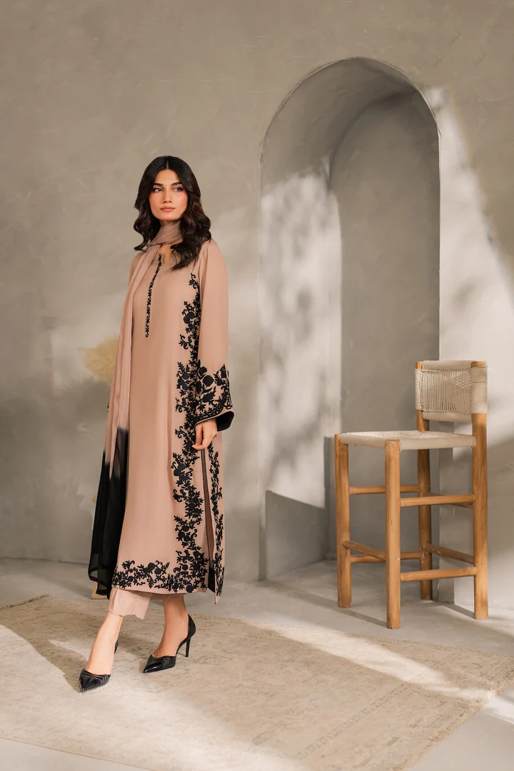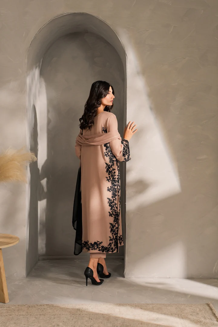 The Remi set is a refined blend of tradition and modernity, this 3-piece outfit in soft cappuccino beige features intricate hand-aari embroidery on the front, back, border, and neckline—highlighting timeless craftsmanship with a contemporary edge. The clean silhouette and subtle detailing makes it perfect for both daytime and evening wear. Complete the look with the separately available two-toned chiffon dupatta for added elegance.