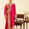 Pure hot pink silk heavily embellished with hand embroidery. Styled with matching straight shalwar and organza dupatta with borders as seen, a beautiful design for your festive events. Laces on dupatta depend on stock (Laces design can change)