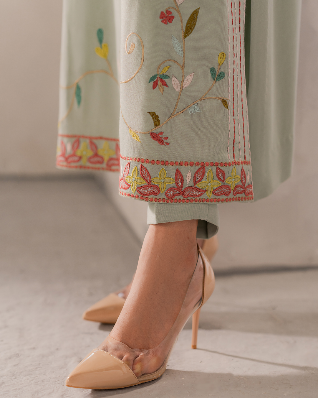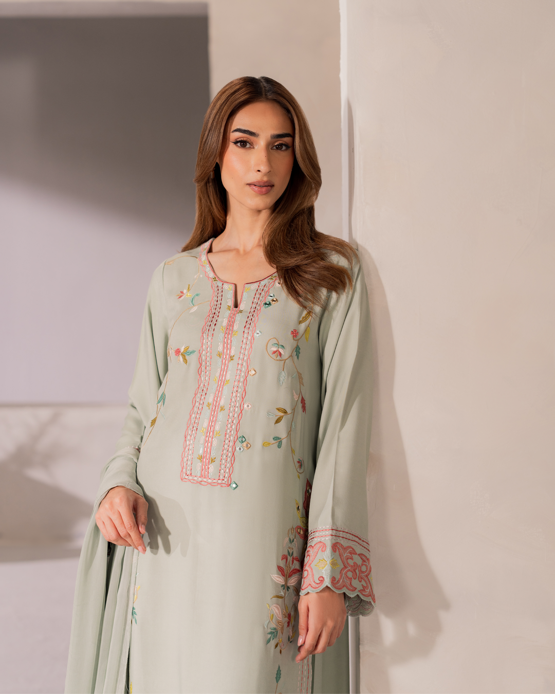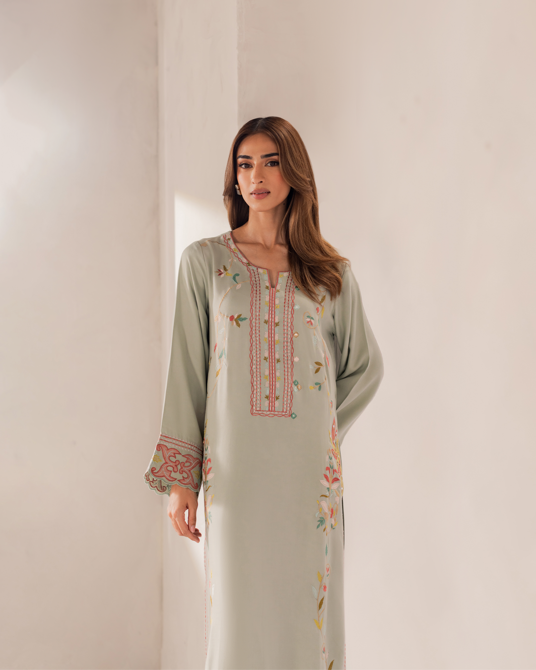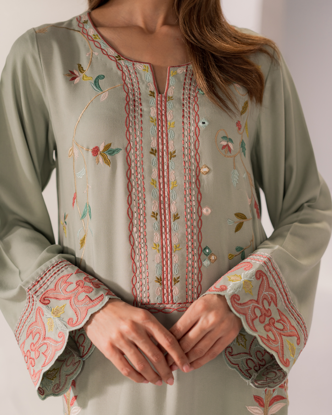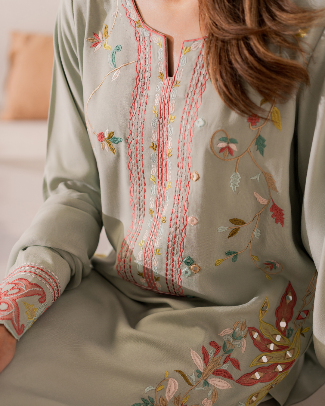Like an orchard with colorful flowers, Sia is an ode to beauty and grace. Light green fine cotton fabric with intricate embroidery patterns, Sia is a dream come true.