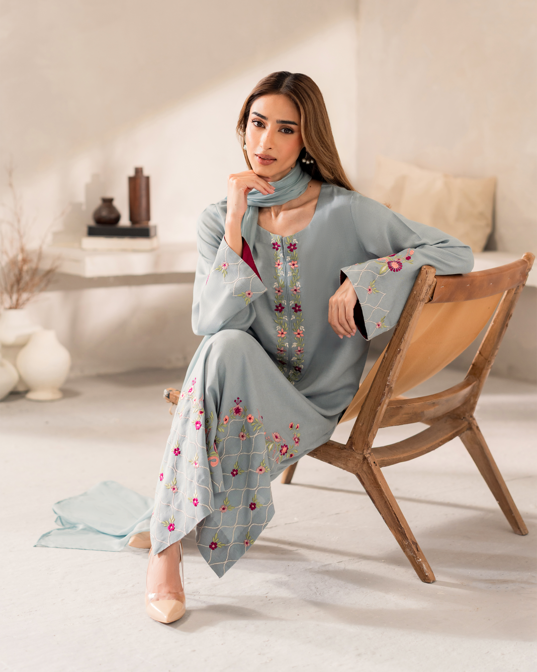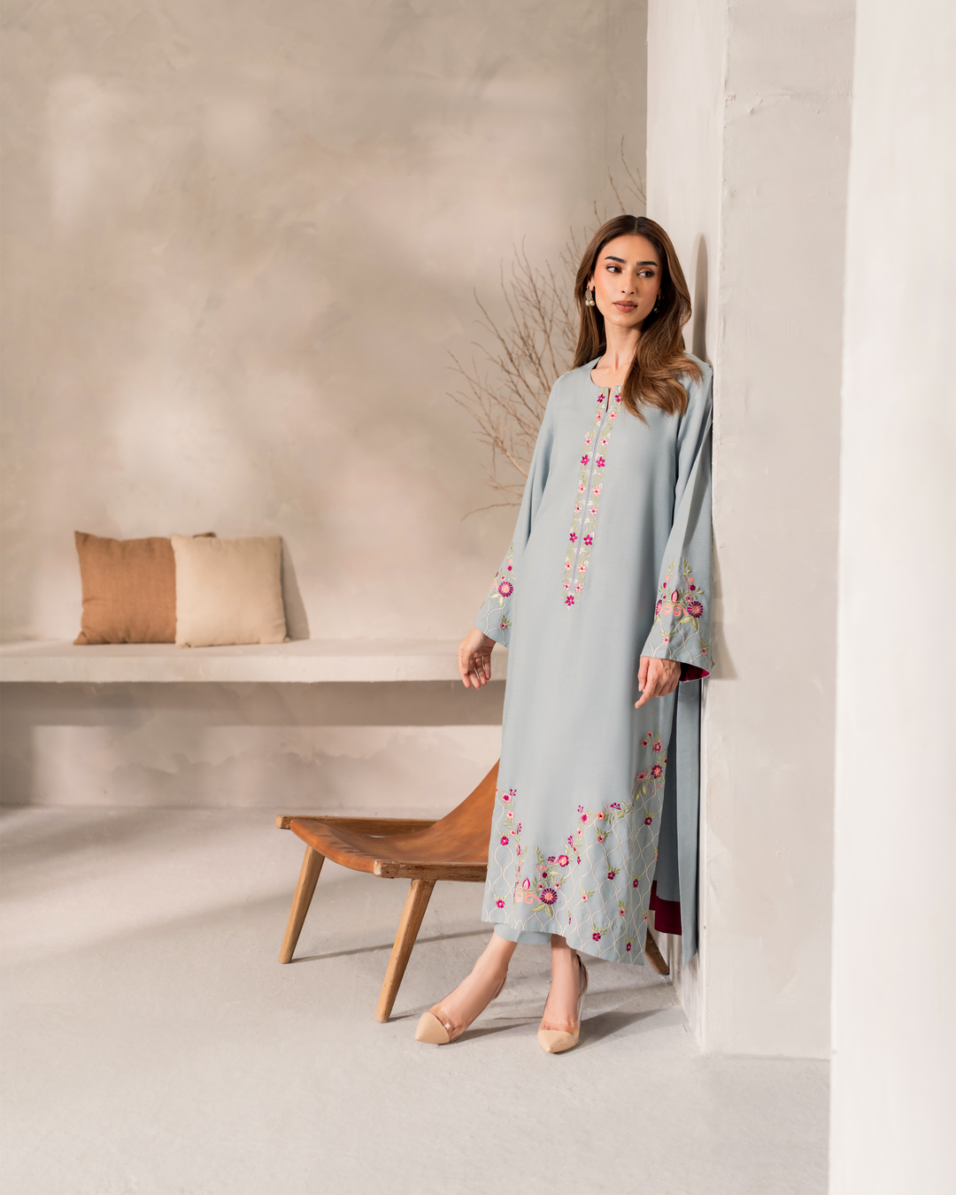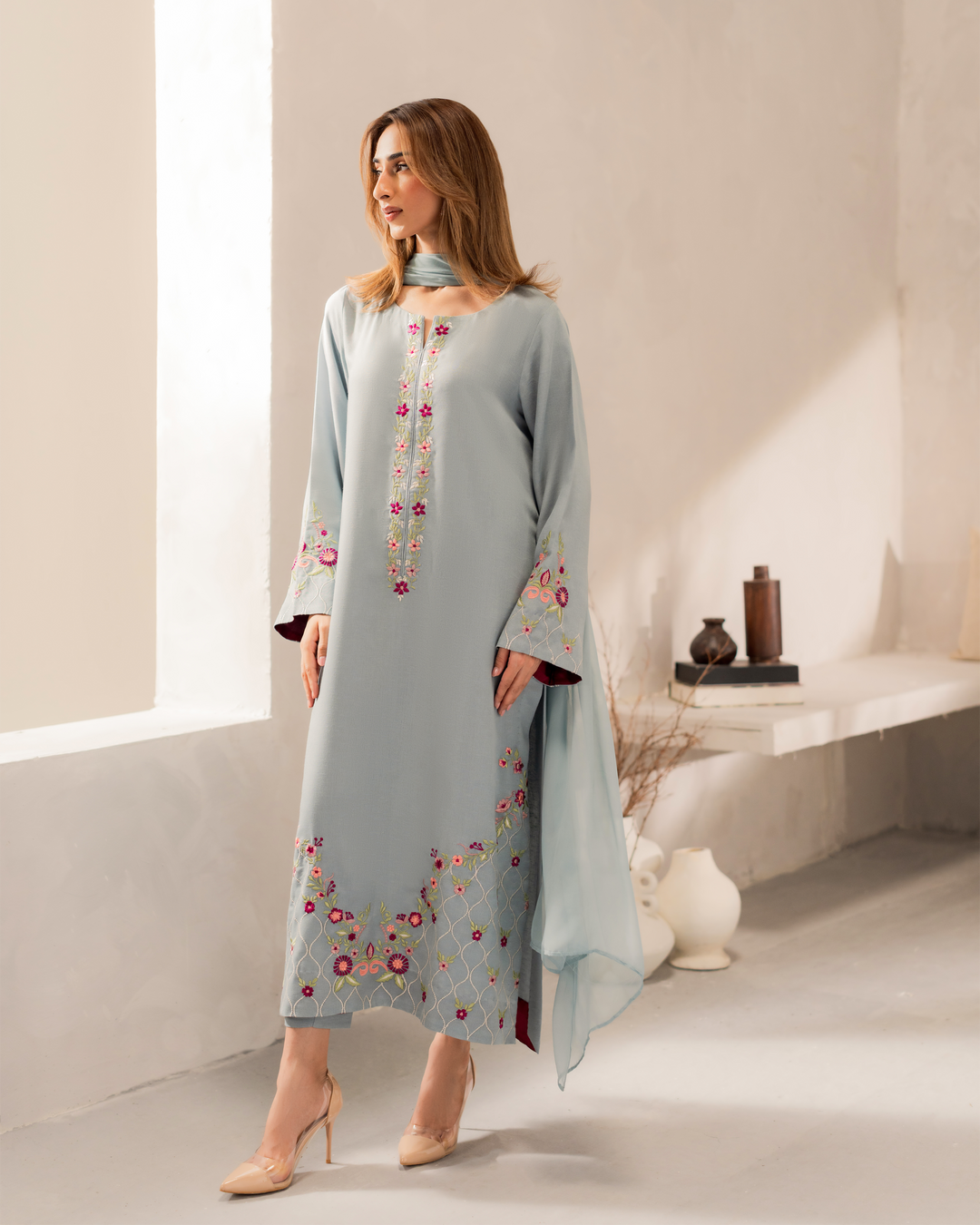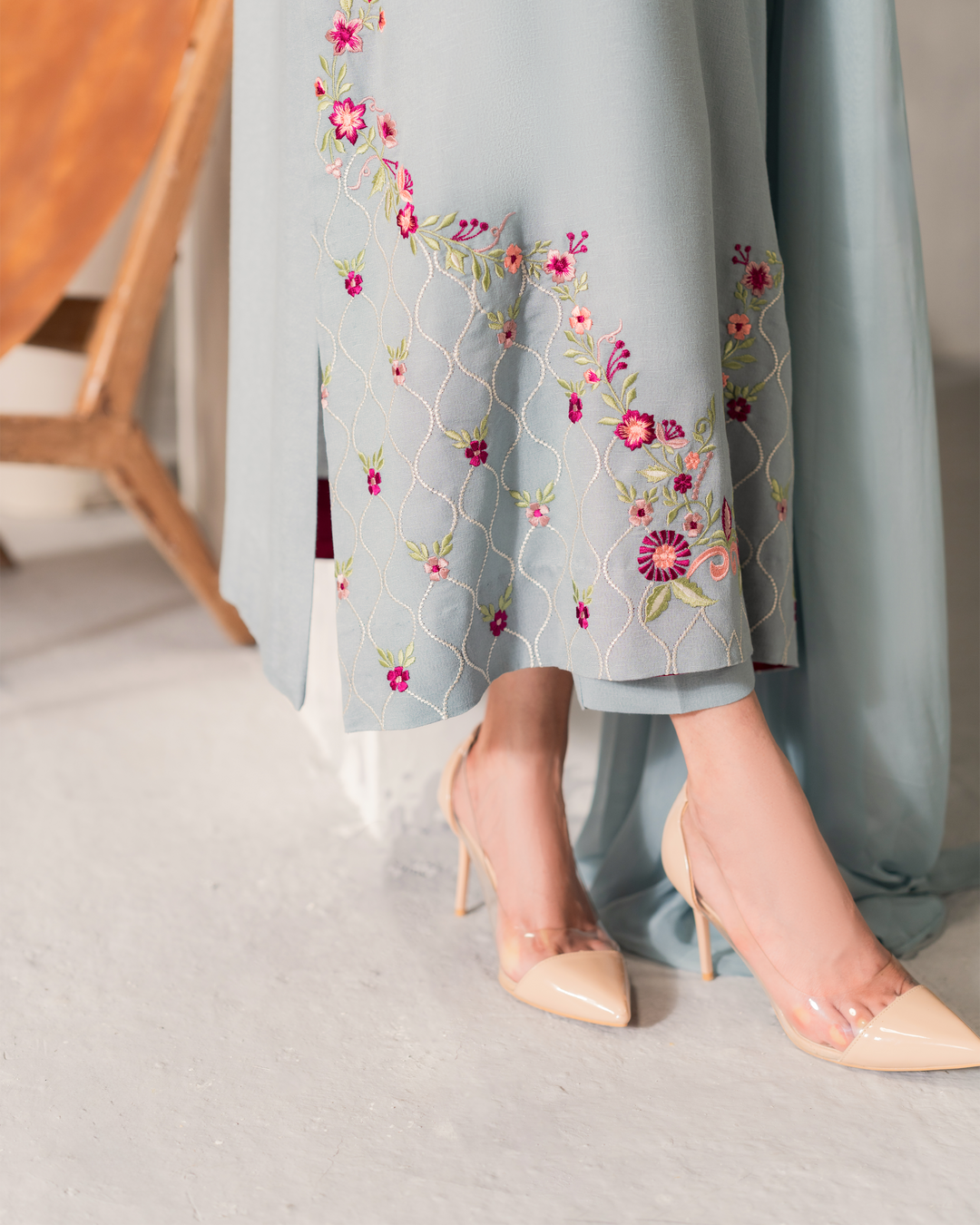 Siena is a Sky Blue dream ensemble with marvelous multicolor embroidery, on our premium cotton fabric.