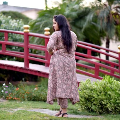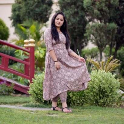 A pretty pink number that employees expert applique work to create a dreamscape. The outfit is demure yet versatile enough to be dressed up for an occasion.