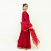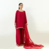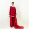 A gorgeous three piece, curated on pure red raw silk, with gold handwork of dabka, sequins and crystals. A beautiful design for the festive season. Styled with an embellished matching pure organza dupatta and flappers.