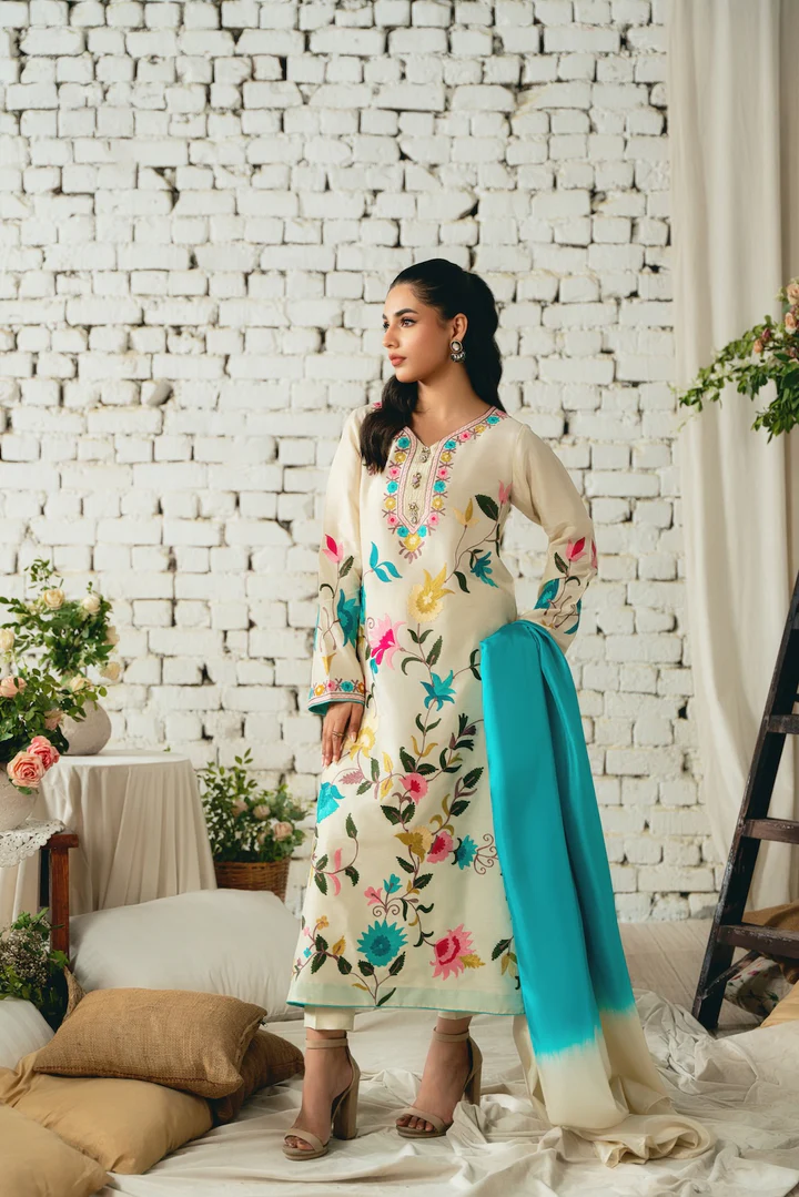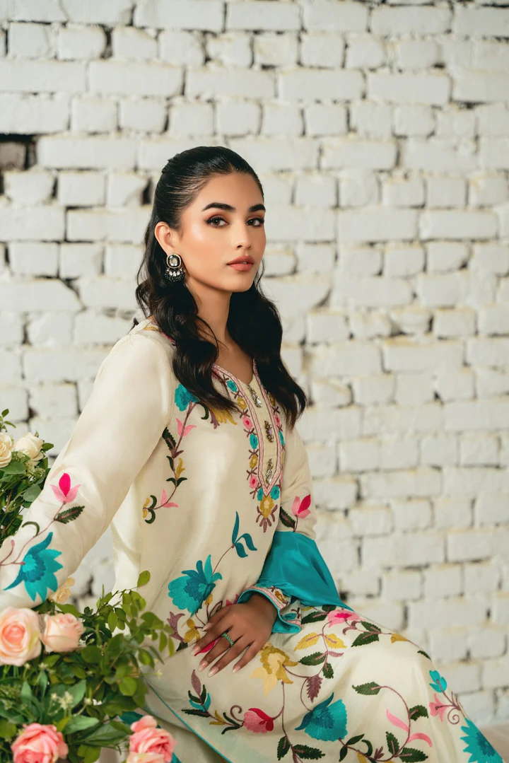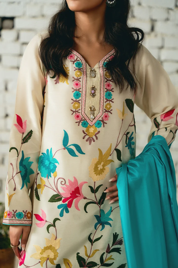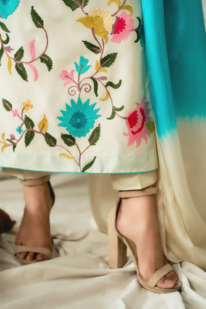 This graceful three piece luxury outfit in a soft cream shade hue embodies elegance and femininity. Made from high-quality, finely textured silk, it offers a refined look perfect for festive and formal occasions. The kurta is adorned with intricate multicolored embroidery in shades of hot pink, green, lavender, and ivory, forming delicate floral and ornamental patterns with organza detailing that add depth and charm. The matching trousers maintain a sleek silhouette, subtly enhancing the overall ensemble. With its dreamy color palette and exquisite craftsmanship, this outfit is a perfect blend of modern sophistication and traditional artistry.